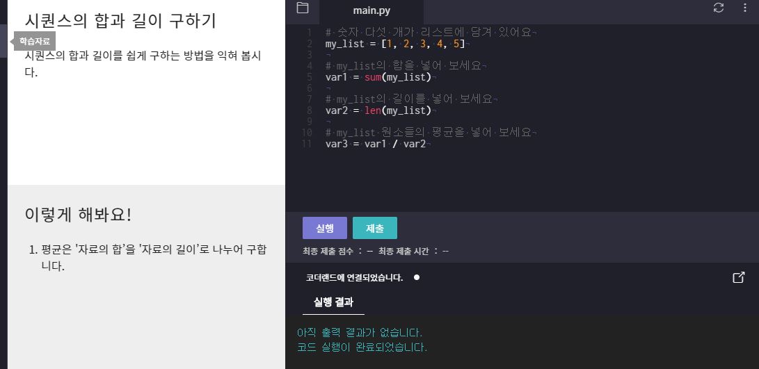 - sum()과 len() : sum()은 숫자 원소로 이루어진 시퀀스 자료의 합을 구하는 함수, len()은 시퀀스 자료의 길이, 즉 원소의 개수를 구하는 함수