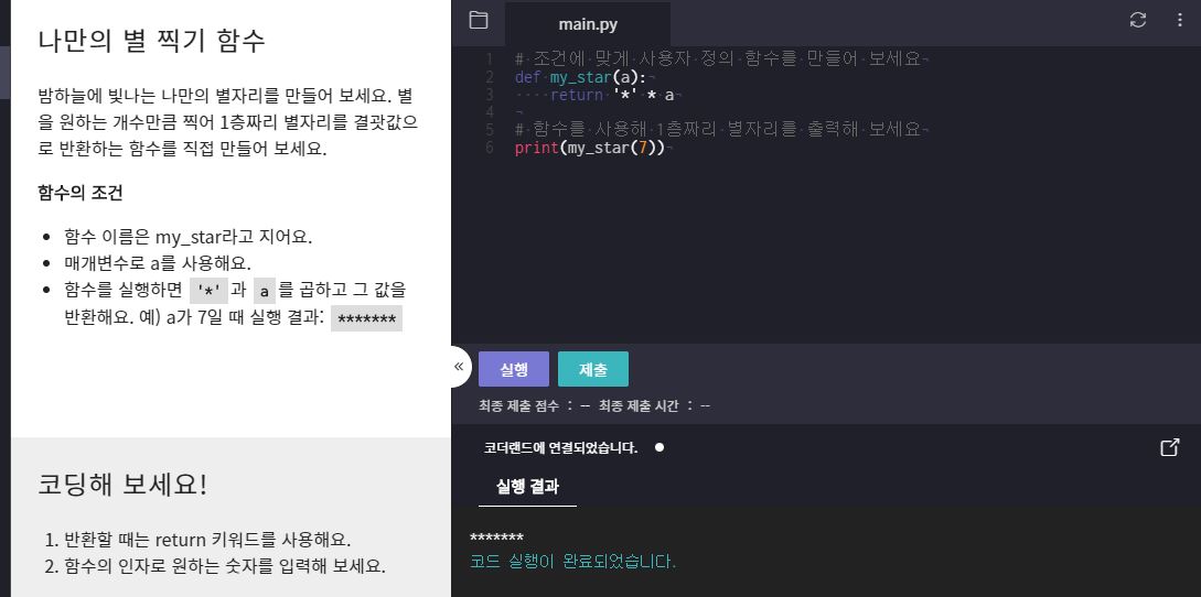 함수와 매서드의 개념을 공부하고, 기본 함수와 사용자 정의 함수에 대해서 익혔다. 함수를 얼마나 자유롭게 잘 다루느냐에 따라 코드의 구조가 눈에 보기 좋은지, 그렇지 않은지를 결정하는 것 같다.