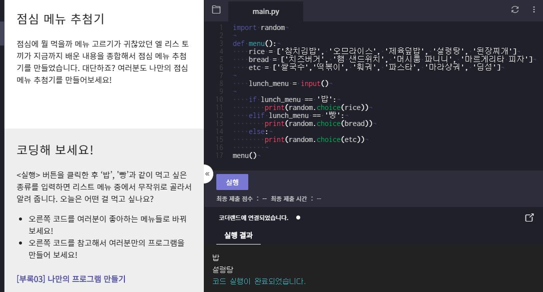 음식 메뉴 고르는 걸 정말 어려워하는데, 이런 코드 간단히 만들어서 활용해보니 재미가 있었다.