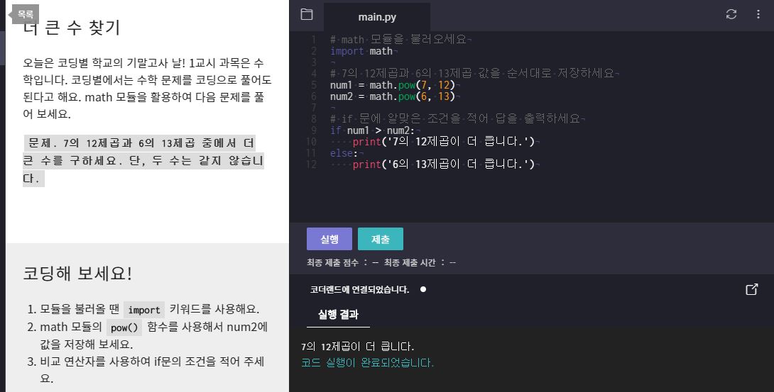 | math.pow(a, b) | a의 b제곱값을 반환하는 함수 |