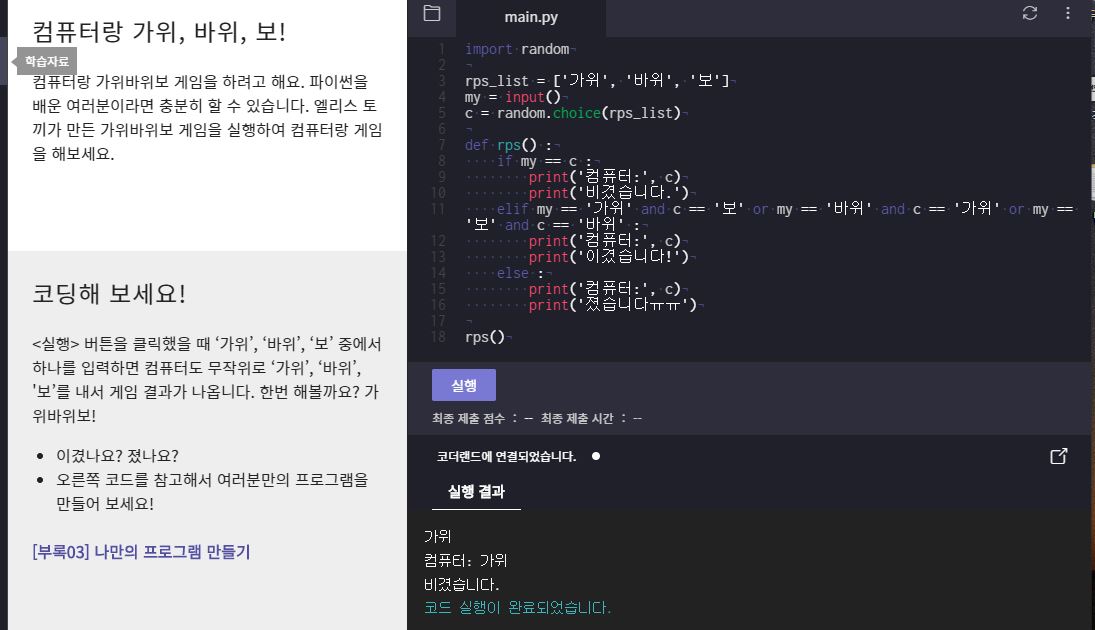 랜덤 함수와 조건문만으로 간단하게 가위, 바위, 보 게임을 만들어 볼 수 있어서 재미있었다.