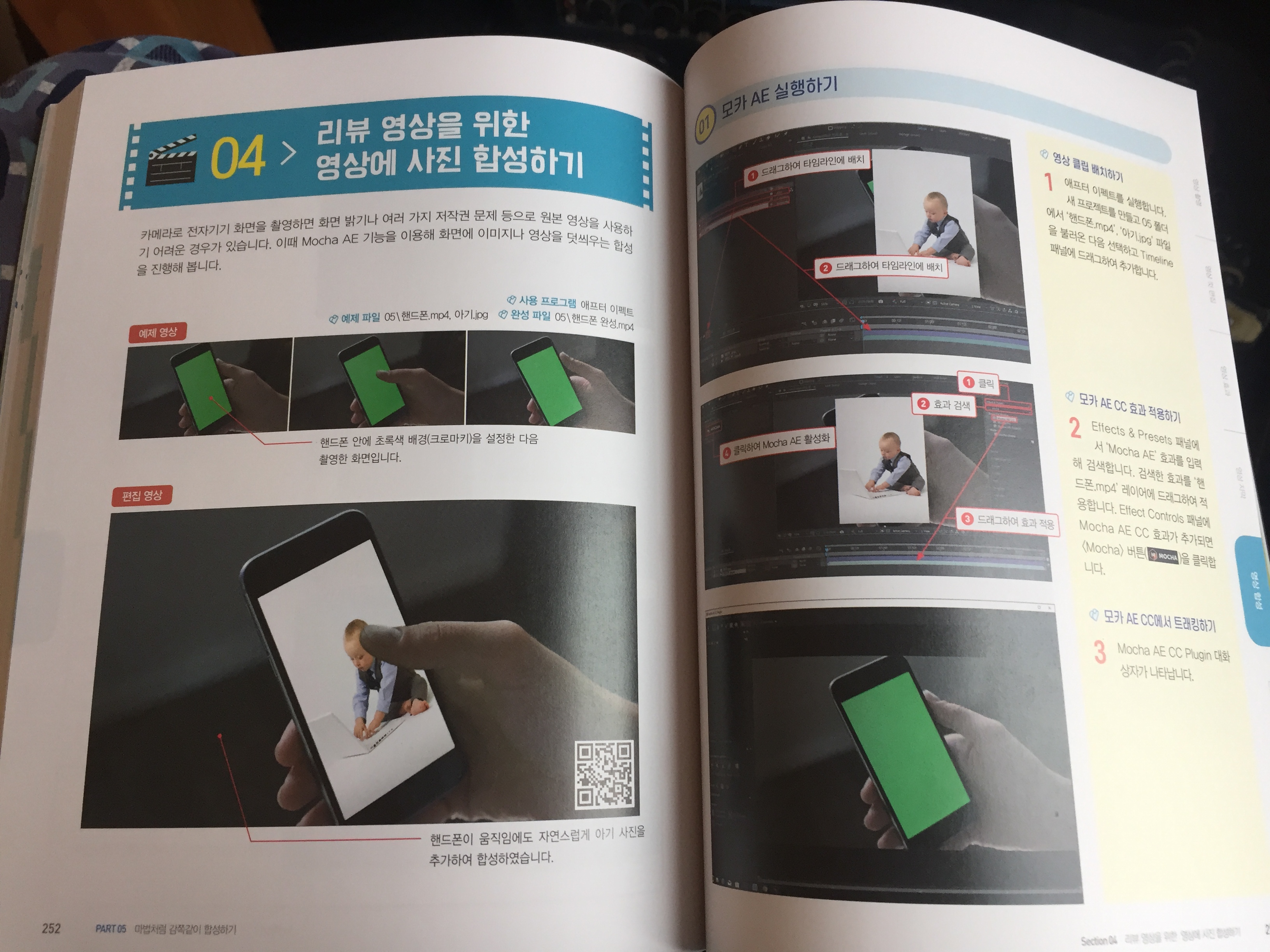 "5장-마법처럼 감쪽같이 합성하기"에서는 드디어 이 책에서 가장 기대를 했던 특수효과에 대한 아이디어들을 나누어주고 있다. 크로마 키로 배경을 합성하는 법, 블렌드 모드로 합성하는 법, 손떨림 보정, 핸드폰 배경 합성과 모션 트래킹, 영상에서 특정 사물 추출하기 등 재미난 기법들이 소개되어 있다.
