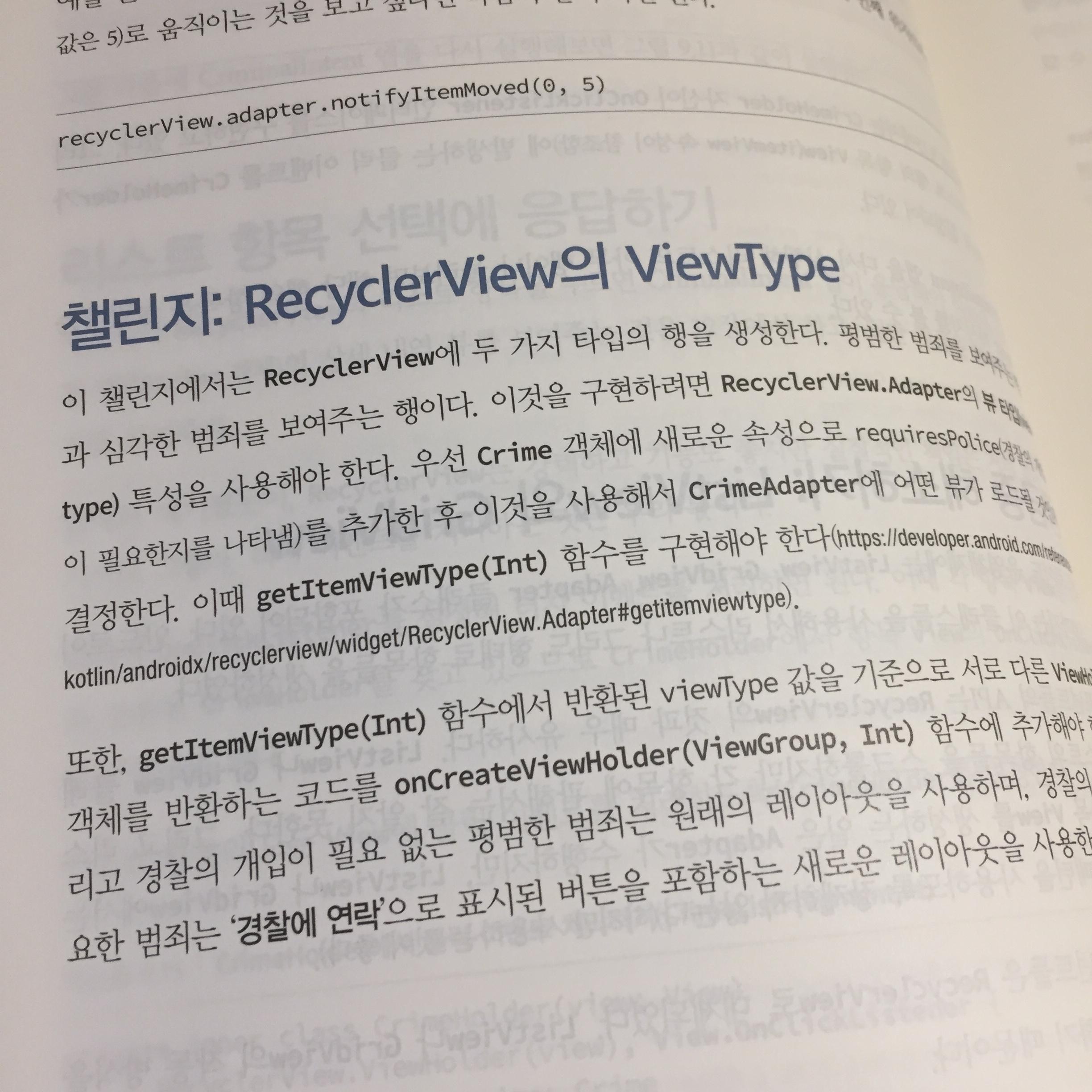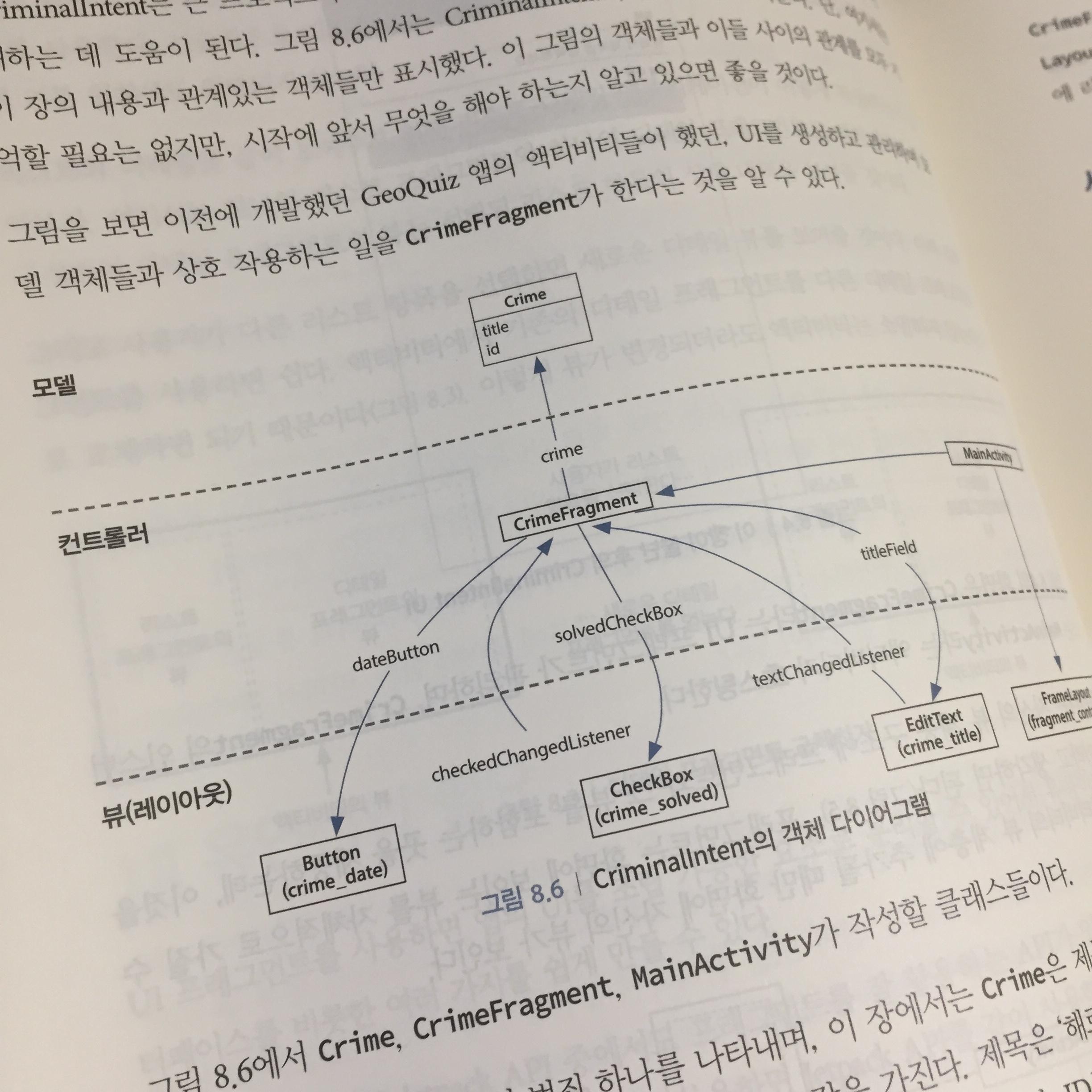 두 번째로 만드는 앱은 CriminalIntent 라는 앱인데, 사무실에서 일어나는 범죄(?)의 상세 내역을 기록하는 앱입니다. 이 앱은 앞으로 총 11개의 장에 걸쳐 완성되는 복잡한 앱입니다. 이 앱을 개발하며 프래그먼트, 리스이클러뷰, 레이아웃, 데이터베이스와 Room 라이브러리, 프래그먼트 간의 이동, 대화상자, 앱바, 암시적 인텐트, 사진 찍기 등 앱 개발에 필요한 각종 개념들을 총망라해 가르쳐줍니다. 마치 내가 만들고 싶은 앱을 구상하고 여기에 필요한 기능을 구현하는 방법을 인터넷에서 찾아 활용하는 방식과 비슷하다고 느껴집니다. 그러다보니 훨씬 실제적이고 실용적인 느낌을 받습니다.