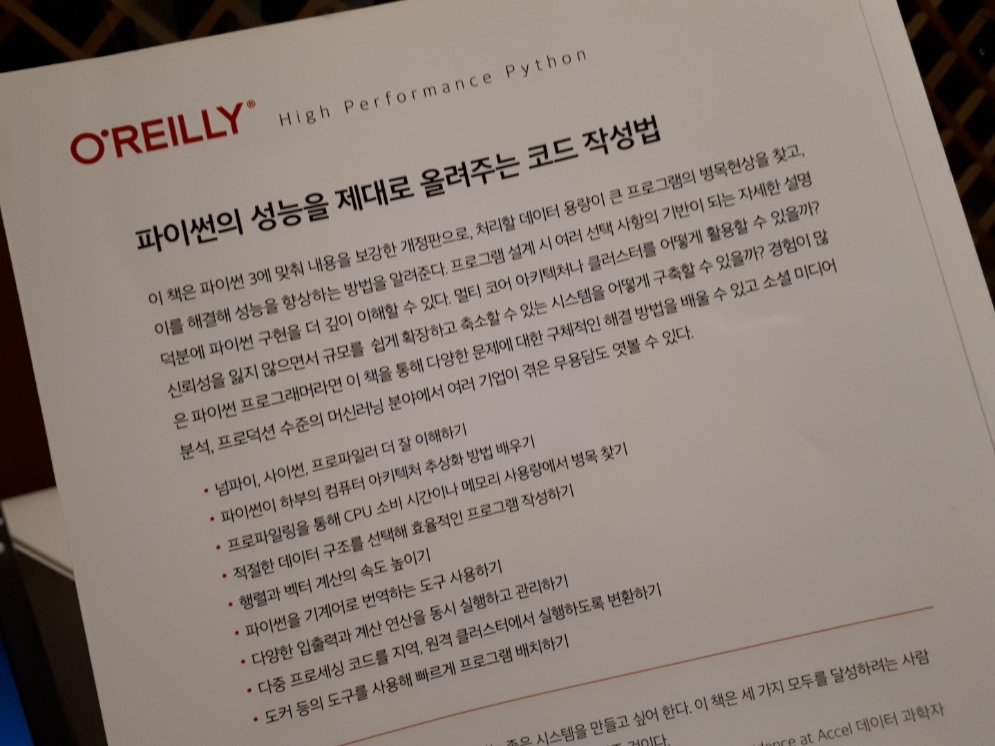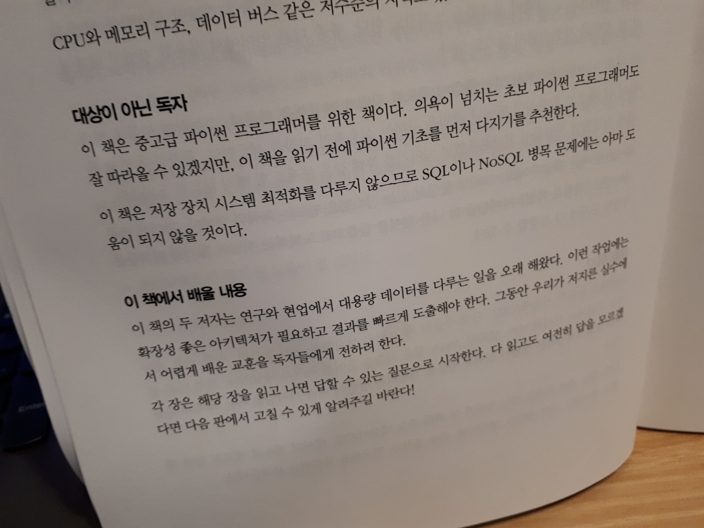 솔직히 지금 저의 수준에서는 이해하기 어려운 부분이 더 많습니다. 파이썬에 대한 기초적인 수준의 코딩으로도 충분하다면 굳이 필요없는 책일 수는 있지만 보다 전문적인 코딩, 성능 개선까지도 중요한 기준으로 가지고 계신 분이라면 충분히 도움이 되는 책인 것 같습니다.