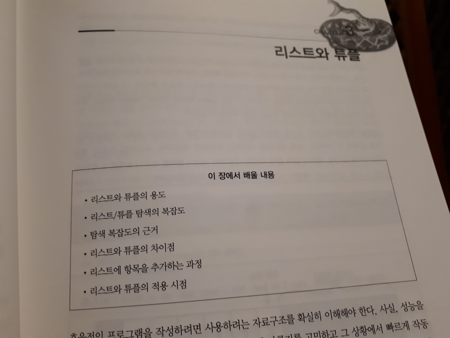 이 책에서는 리스트와 튜플(3장)을 비교하면서 자료구조, 용도, 복잡도, 차이점 들을 자세하게 설명하며 성능의 차이를 알려줍니다. 리스트는 동적배열이고 튜플은 정적 배열이라 어떤 차이가 발생하는 지를 저수준의 자료구조 단계에서 부터 설명합니다.