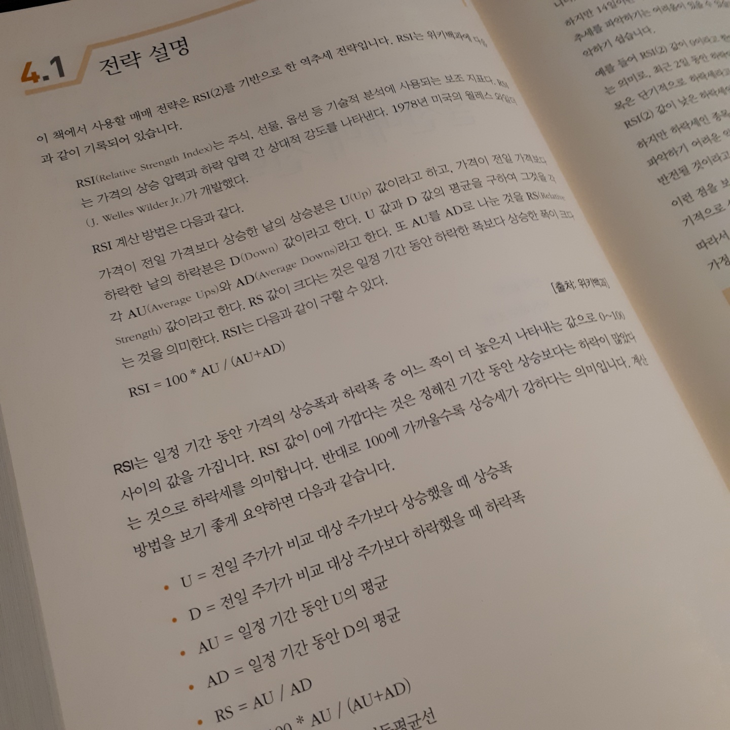 4장은 아주 짧은 장이다. 이 책에서 개발할 매매프로그램의 실전매매 전략을 소개한다. 이 책에서는 RSI(2)를 기반으로 한 역추세 전략을 사용한다. RSI (Relative Strength Index) 지표를 활용하여 매수, 매도 조건을 설정하고 이에 따른 백테스팅 결과를 소개한다. (* 물론 이 전략이 수익을 보장하지는 않는다!)