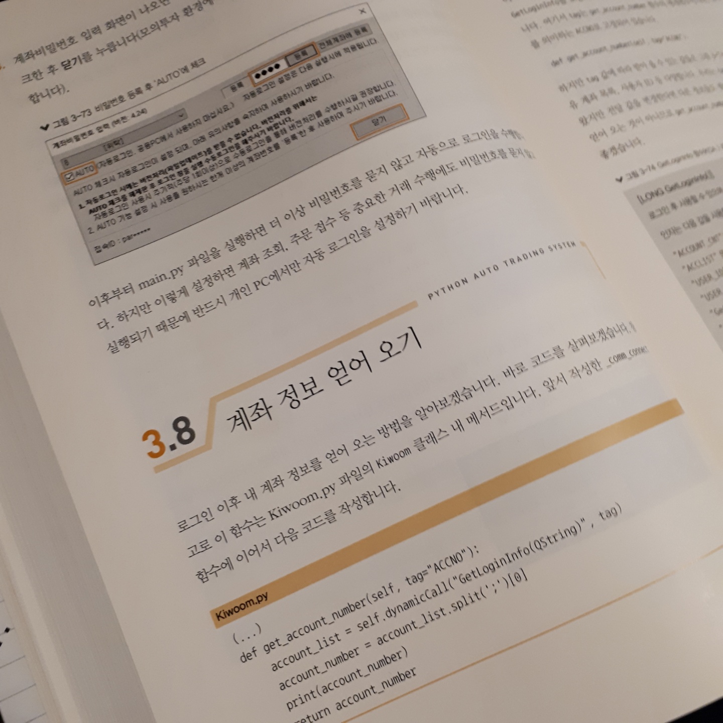 3장에서는 키움증권에서 제공하는 Kiwoom API 사용법에 대해 다룬다. 친절하게 키움증권 계좌개설 방법을 설명해주늑 것부터 시작하여 Open API 내려받는 법, KOA Studio (Kiwoom Open API+ : API를 테스트해볼 수 있는 환경을 제공하는 프로그램), PyQt5, 키움증권 로그인 등 키움증권 자동매매 프로그램 개발을 시작하기 위한 준비 작업들을 해볼 수 있다. 이어서 가격 정보(일봉), 예수금 정보를 얻어오고, 주문 접수 및 체결 확인, 주문 정보, 잔고, 실시간 체결 정보 등을 얻어오는 방법들을 배워볼 수 있다. 책 전체를 통틀어 3장의 분량이 가장 많다. 여기까지 오면 실전매매 프로그램을 개발할 준비는 끝난다.