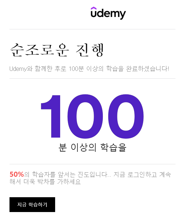 어느 날 저에게 이메일 한 통이 도착했습니다. 보낸이는 Udemy 였습니다. "지금까지 100분 이상의 학습을 진행했고, 이것은 50%의 학습자를 앞서는 진도"라구요. 사실 아직 2일차까지 스터디를 진행하지 못했는데, 굉장히 큰 격려를 받은 것 같았습니다. 격려를 힘입어 다시 학습을 시작합니다. 파이썬 스터디 3일차 시작!!