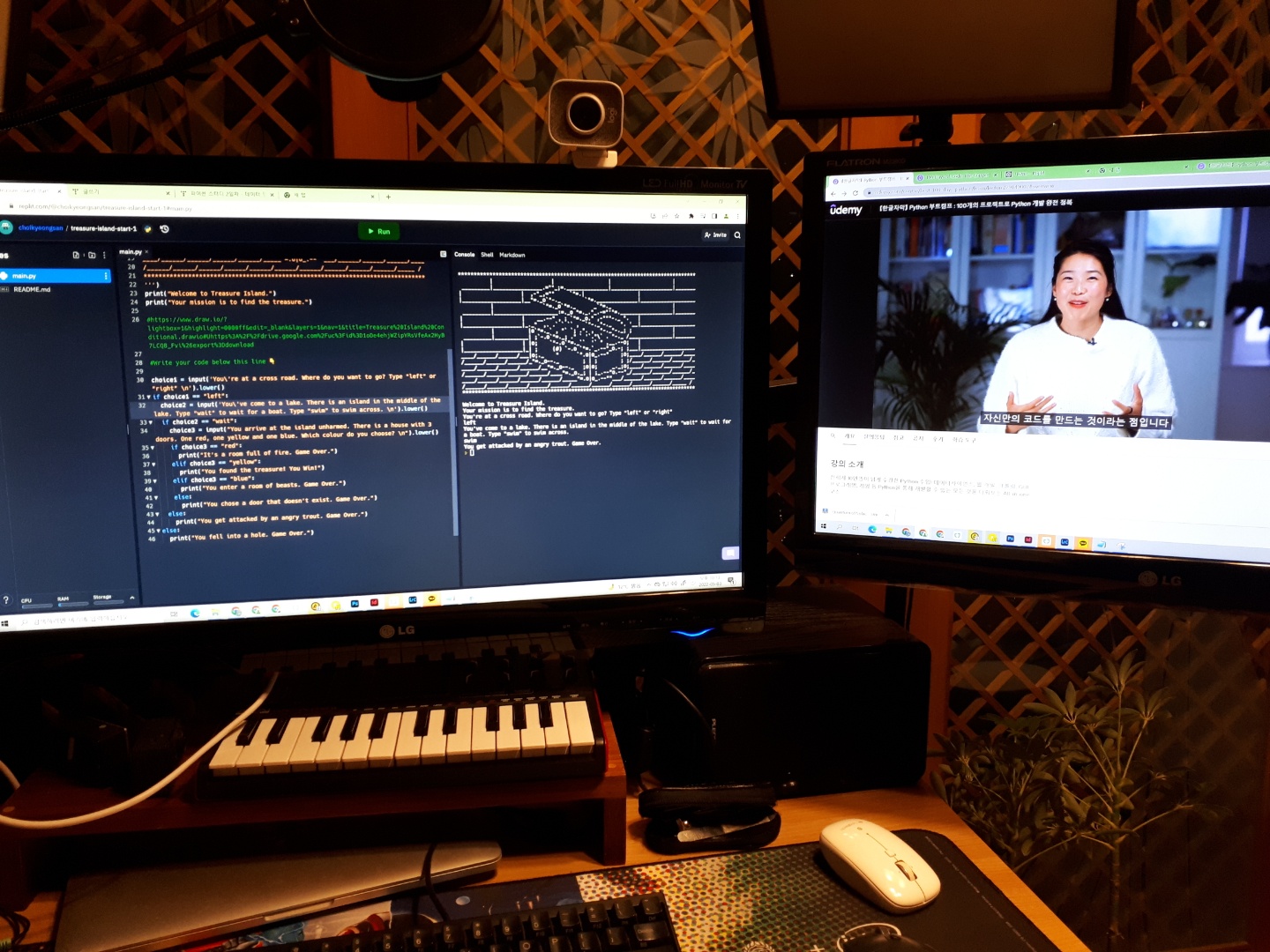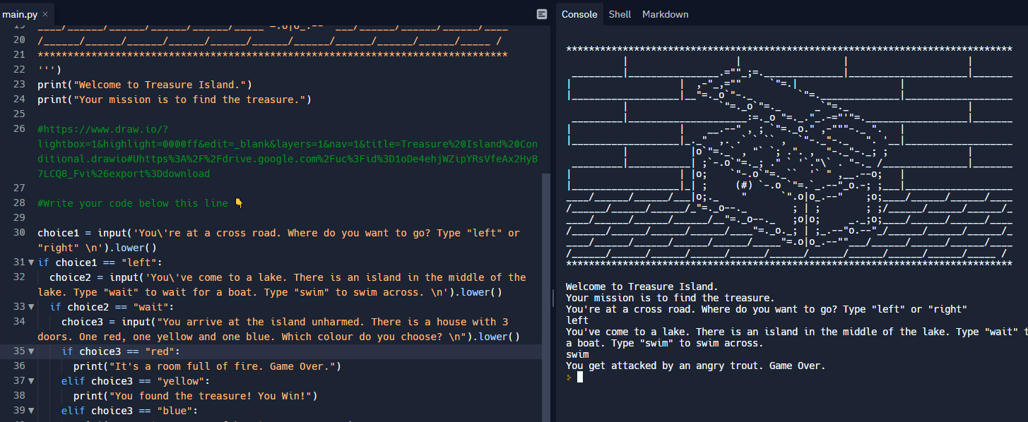 지금까지 배운 조건문을 이용해서 보물섬 찾기 게임을 만들어 보았습니다. 아직은 초기 단계(?)라 특정 답을 했을 경우에만 살아남을 수 있고 그렇지 않으면 그냥 게임 오버입니다. ㅋ