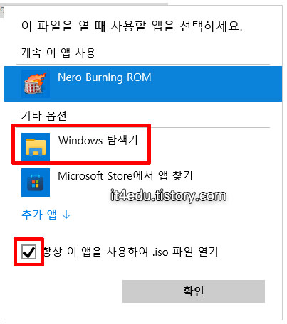 기타 옵션에서 [ Windows 탐색기 ]를 선택하고, 항상 이 앱을 사용하여 .iso 파일 열기 옵션을 체크한 뒤에 확인 버튼을 클릭합니다.
