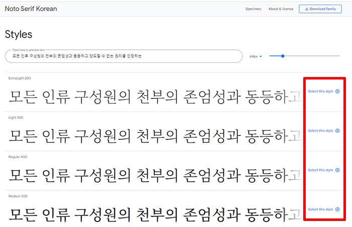 폰트에 따라 다음 화면이 조금씩 다를 수는 있는데 스크롤을 움직여서 아래로 내려가 Styles 부분을 찾습니다. 화면 오른쪽에 [ Select this style + ] 버튼을 눌러 원하는 스타일들을 선택합니다.