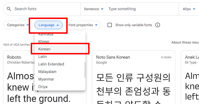 굳이 언어를 선택하지는 않아도 되지만, 한글 폰트 위주로 찾기 쉽도록 Korean Language를 선택합니다.