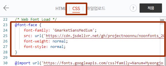복사한 스크립트를 적용하기 위해 [ CSS ] 항목을 선택하고 적절한 위치에 붙여넣어줍니다. 티스토리에서 기본적으로 제공하는 반응형 스킨에는 친절하게 /* Web Font Load */ 라고 주석 처리를 해 준 영역이 보입니다. 그 밑에 살짝 붙여 넣어주었습니다.