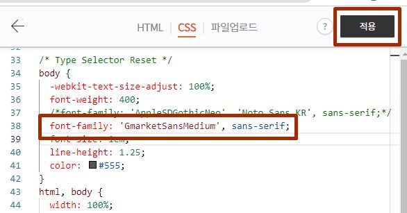티스토리 블로그 전체적으로 폰트를 모두 변경하시려면 아래 이미지에서 보시듯이 body 태그에 font-family를 변경하시면 됩니다.