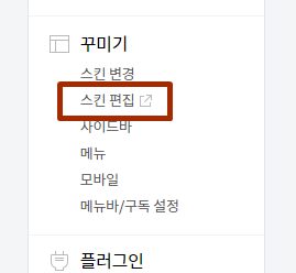 우선 관리자 모드로 들어가셔서 화면 왼쪽 메뉴에서 [ 꾸미기 > 스킨 편집 ] 항목을 선택합니다.