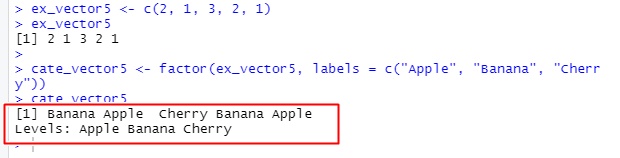 cate_vector5 <- factor(ex_vector5, labels = c("Apple", "Banana", "Cherry"))