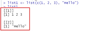 list1 <- list(c(1, 2, 3), "Hello")