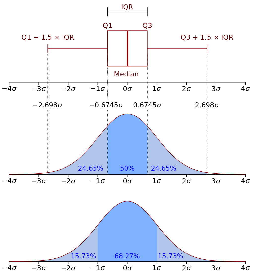 위키피디아(https://en.wikipedia.org/wiki/Box_plot)에서 가져온 이미지입니다. 상자그림과 표준정규분포($\mu = 0$, $\sigma^2 = 1$) 그래프를 비교해볼 수 있습니다.