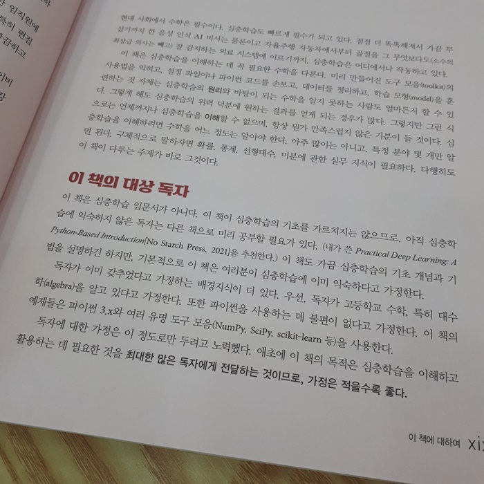 이 책은 기본적으로 수학책 입니다. 딥러닝에 대한 구현 자체 내용 보다는 구현을 위한 수학 이론들을 다루고 있습니다. 저자가 설명한 대로 이 책은 심층학습의 기초를 가르치지는 않습니다. 심층학습에 대한 기본적인 배경 지식이 있는 것으로, 그리고 파이썬에 대한 기초 지식도 있는 것을 가정하고 있습니다. 수학책이니까!