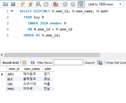SELECT DISTINCT M.mem_id, B.prod_name, M.mem_name, M.addr