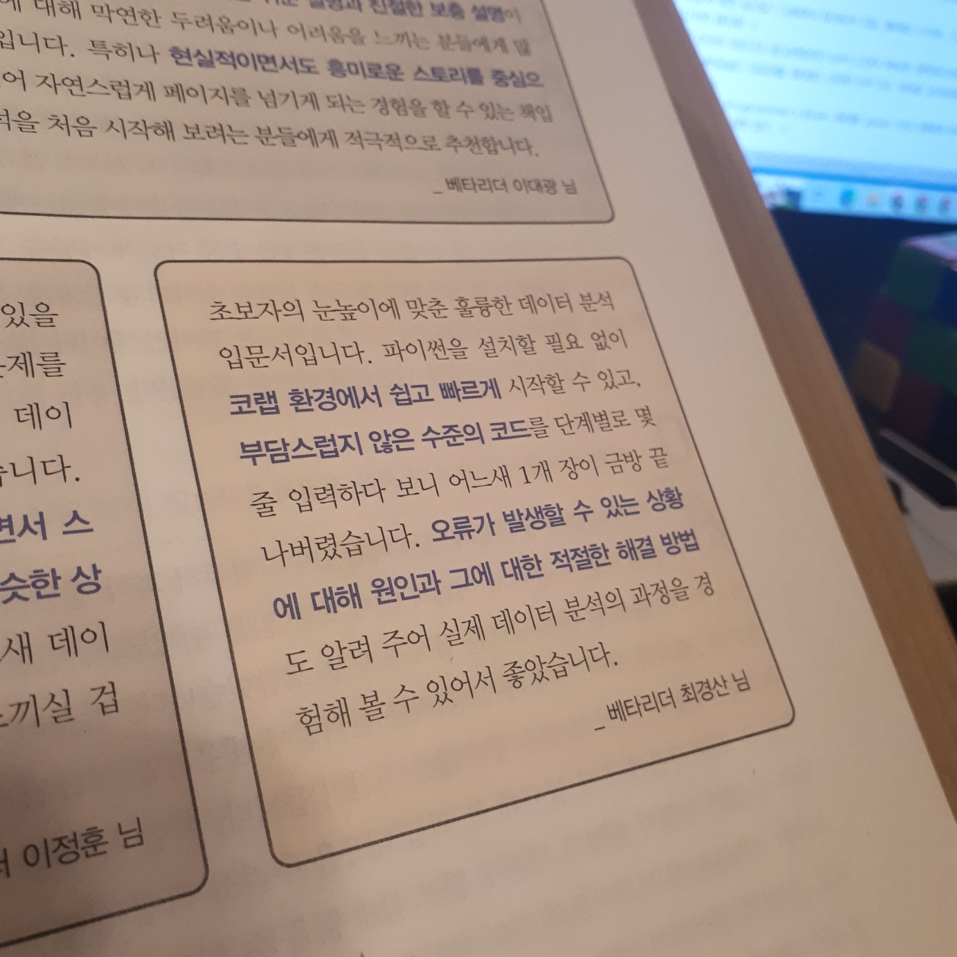 "초보자의 눈높이에 맞춘 훌륭한 데이터 분석 입문서입니다. 파이썬을 설치할 필요 없이 코랩 환경에서 쉽고 빠르게 시작할 수 있고, 부담스럽지 않은 수준의 코드를 단계별로 몇 줄 입력하다 보니 어느새 1개 장이 금방 끝나버렸습니다. 오류가 발생할 수 있는 상황에 대해 원인과 그에 대한 적절한 해결 방법도 알려 주어 실제 데이터 분석의 과정을 경험해 볼 수 있어서 좋았습니다."