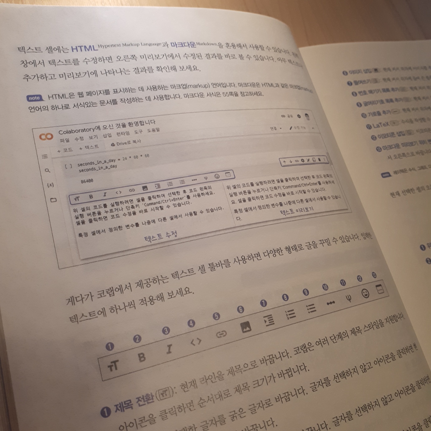 그리고 파이썬을 내 컴퓨터 환경에 설치하는 것이 어떤 사람에게는 큰 일이 아닐 수도 있지만 또 어떤 사람에게는 까다로운 일일 수도 있습니다. 이 책에서는 코랩 환경을 소개하고 있습니다. 온라인이 연결된 환경이면 파이썬 설치 없이 연습해볼 수 있는 도구인데, 코랩 사용법도 자세하게 나와 있어 따라하기 좋았습니다.