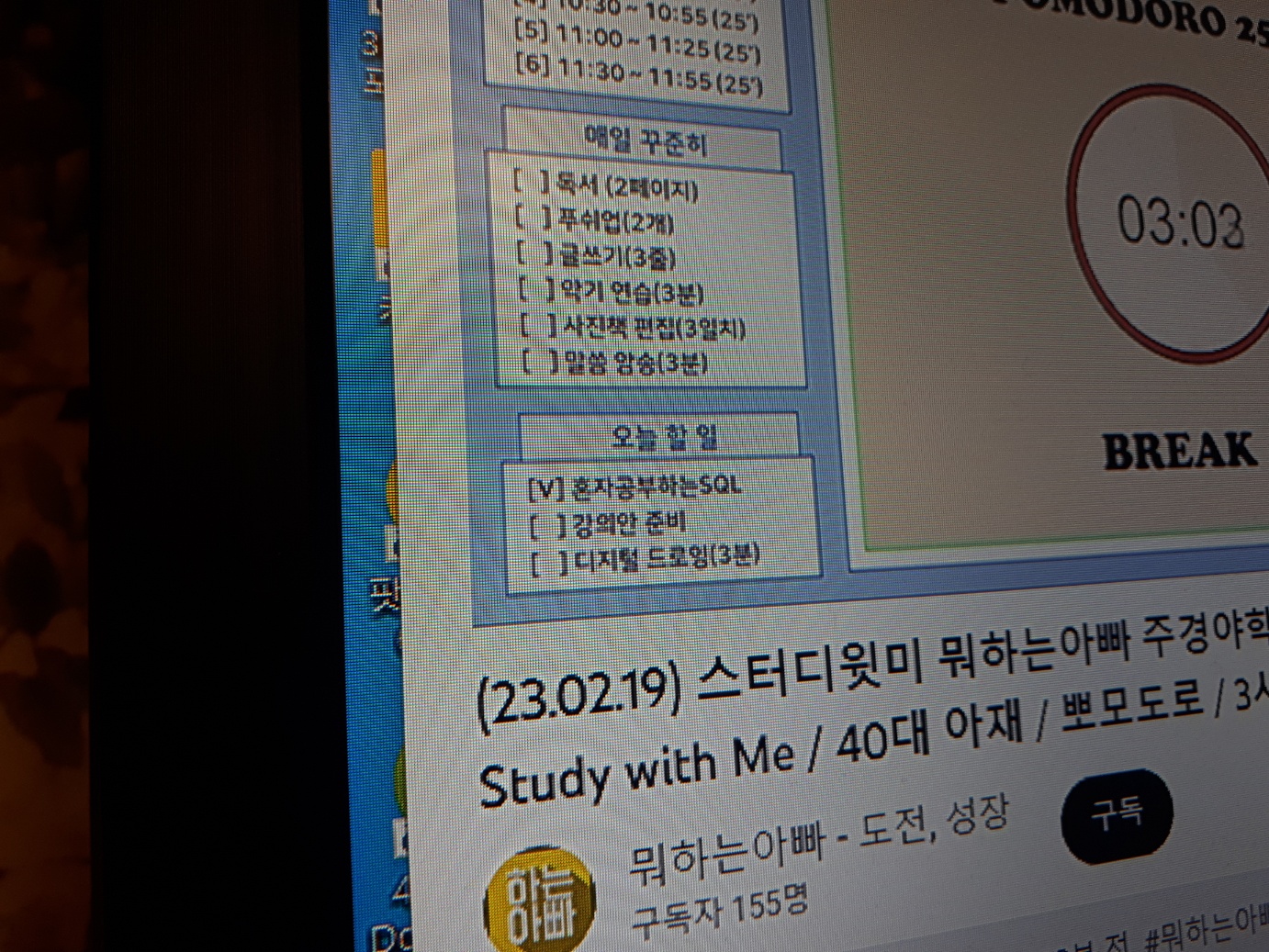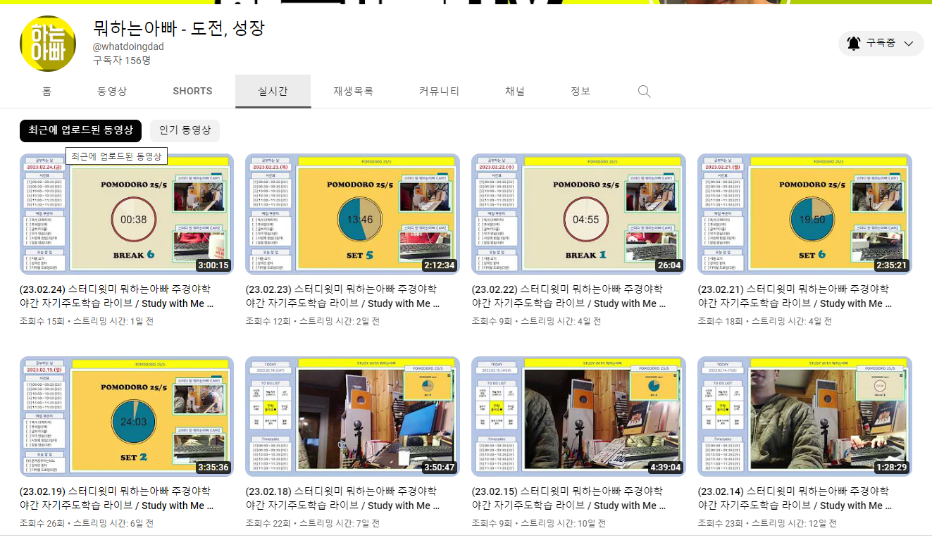 이번엔 개인적으로 더욱 강력한 동기부여 전략을 실천해보았습니다. 바로 스터디윗미죠! 저녁에 애들 재우고 나면 완전 녹초가 되어 쇼파나 침대에 누워 스마트폰과 하나가 되는 시간이 너무 많아졌다는 걸 깨닫게 되었습니다. 그 시간을 조금 더 잘 사용해보고 싶어서 밤 9시가 되면 웹캠과 유튜브 라이브 방송을 켰습니다. 이렇게 억지로라도 화면을 켜 놓으니 책 한자라도 더 보고, 불필요한 인터넷 시간도 줄일 수 있었습니다. 목표했던 혼공단 활동도 훨씬 가벼운 마음으로 완료할 수 있었습니다.