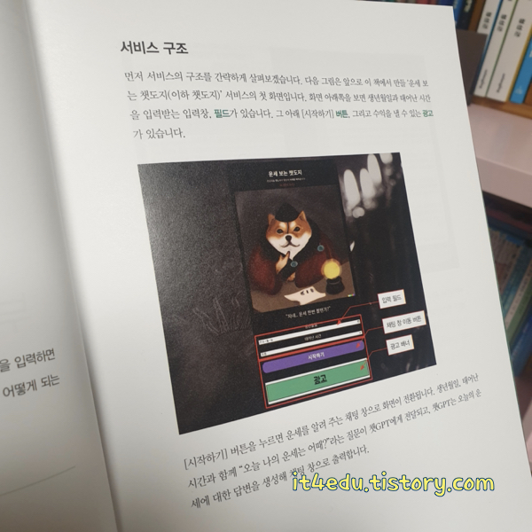 1장과 2장에서 어떤 서비스를 만들 것인지(챗도지 라는 이름의 운세 서비스), 챗GPT는 무엇이며 어떻게 사용하는 지를 설명합니다.