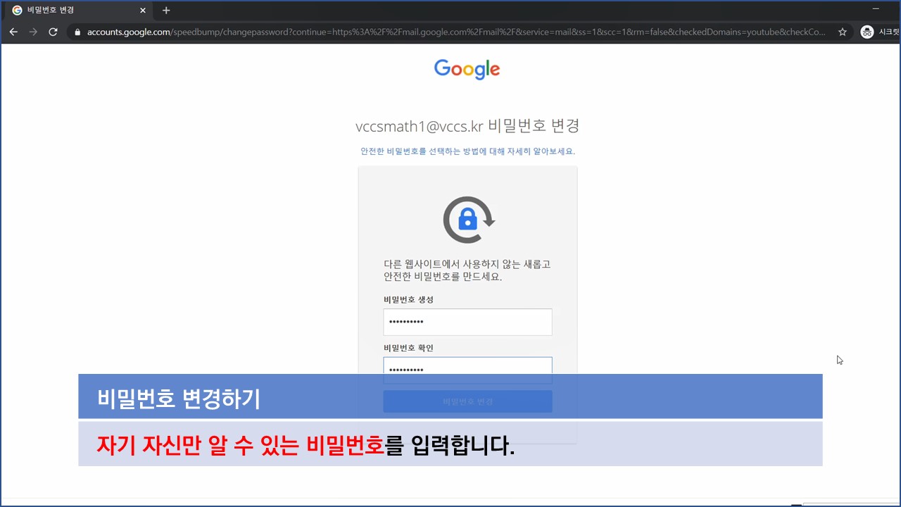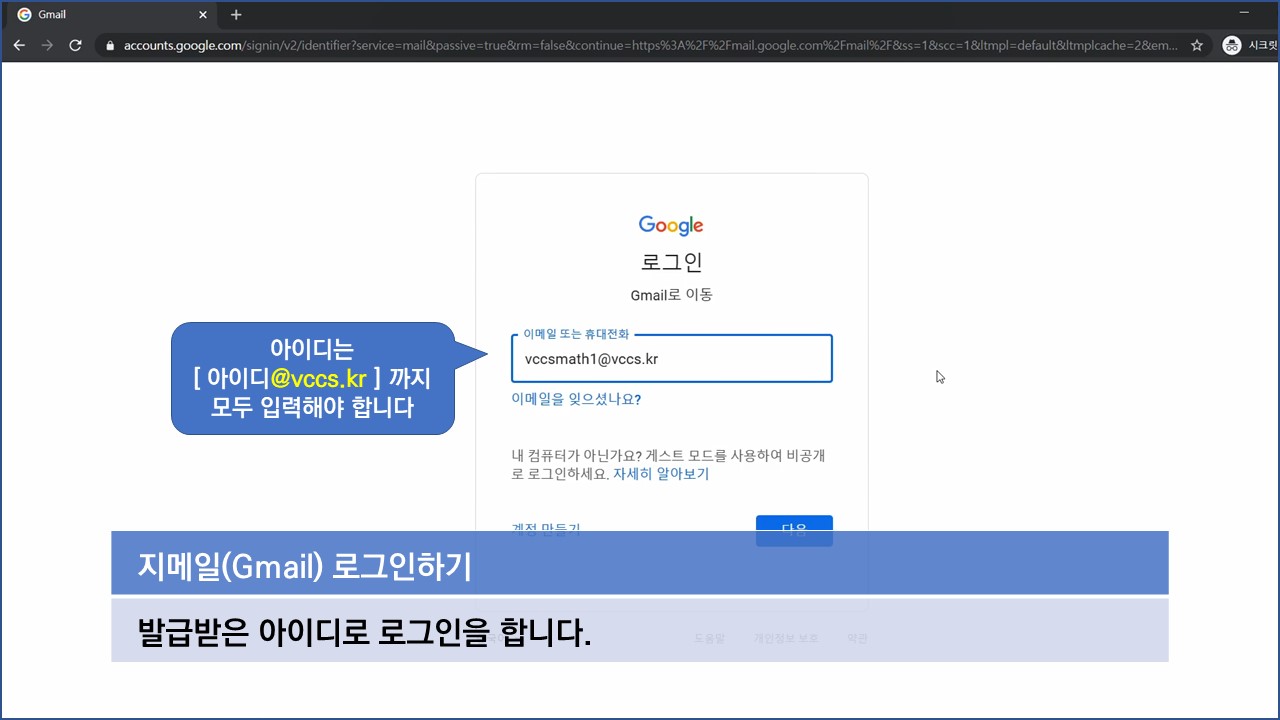 여기서 주의할 점은 학교에서 발급 받은 아이디가 vccsmath1 이라고 한다면 아이디를 이대로 입력하면 안된다는 것이에요. 반드시