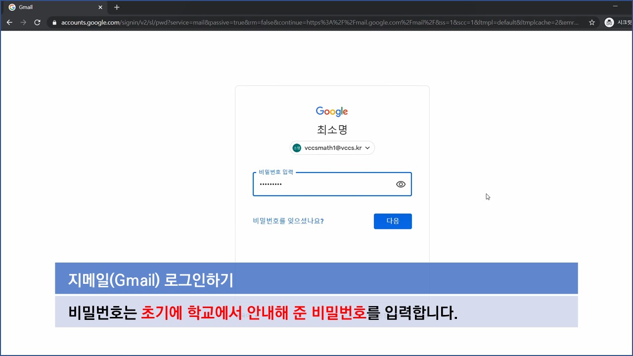 학교 계정으로 처음 로그인 할 때에는 학교에서 안내해준 비밀번호로 로그인을 해야 해요.