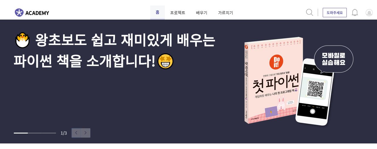 - PC에서 코딩하기 : 엘리스 아카데미(https://academy.elice.io)에 접속한 후 회원 가입하고 로그인 ▶ 'Do it! 첫 파이썬' 검색하여 과목 선택 ▶ <수강신청>클릭 ▶ <배우기> 클릭