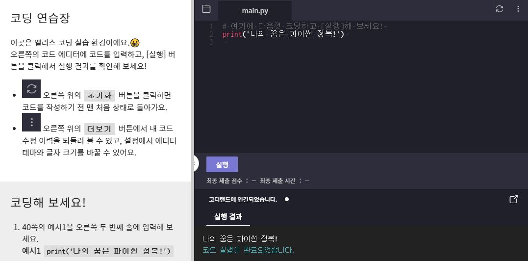 - 모바일 앱에서 코딩하기 : 앱 스토어나 플레이 스토어에서 '엘리스'를 검색해서 엘리스 앱 설치 ▶ 엘리스 앱을 실행해 회원 가입후 로그인, 기관은 <Elice Academy>를, 모드는 <학생>을 선택 ▶ 'Do it! 첫 파이썬' 검색하여 과목 선택하고 <수강신청> 클릭 ▶ [수업 목록]에서 공부할 내용 선택하고 실습 문제 코딩하기