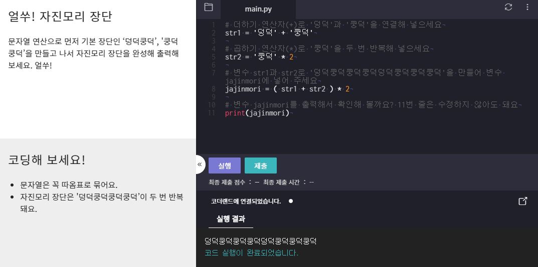 - + (더하기)와 * (곱하기)를 이용하면 문자열을 이어 붙이거나, 반복할 수 있다.